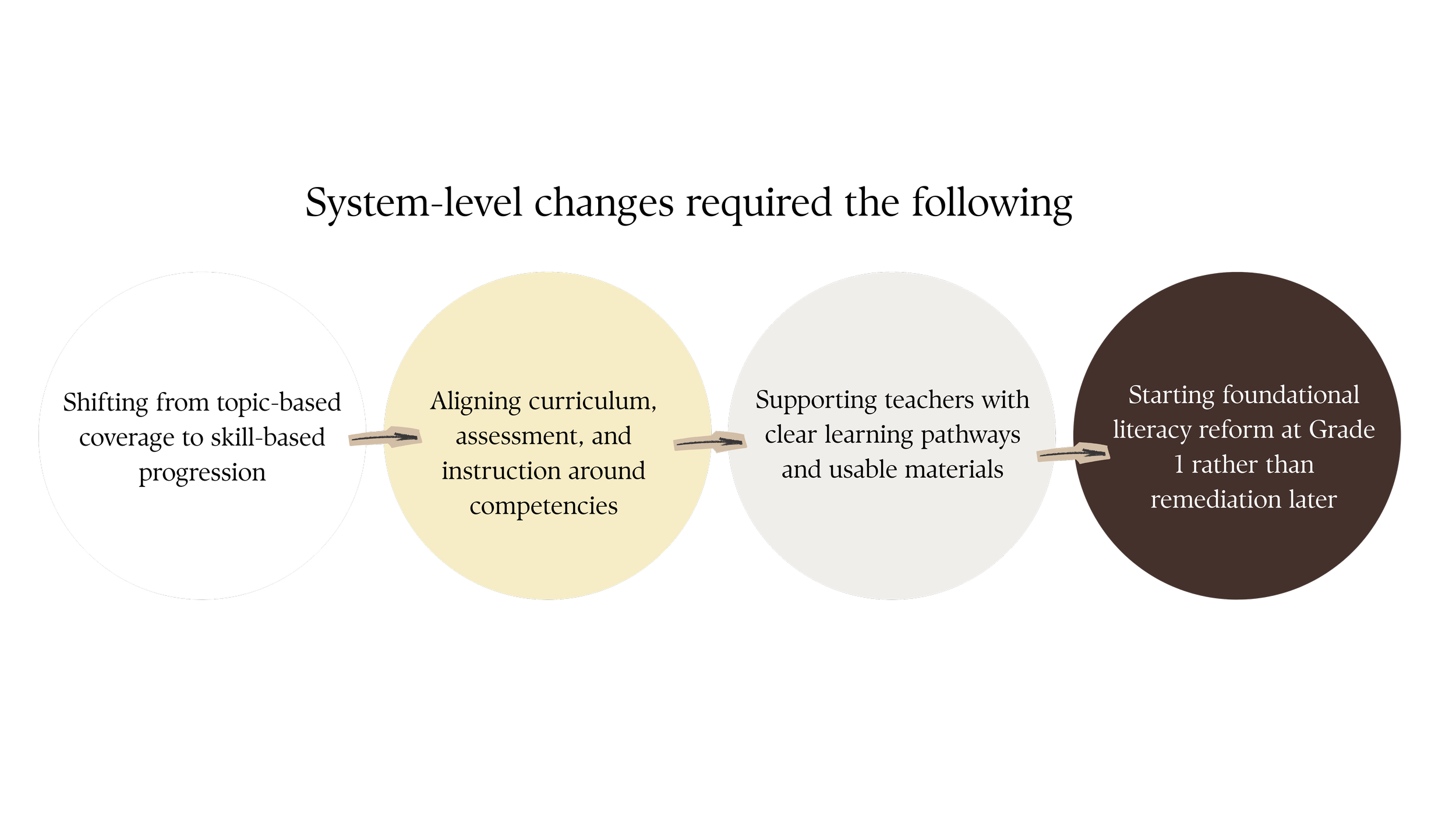 Systemic change is needed because foundational literacy is cumulative. If students do not master decoding, vocabulary, and basic sentence structure in the early grades, later instruction becomes ineffective, no matter how much content is added. Without a curriculum that clearly defines what mastery looks like at each stage, learning remains inconsistent across classrooms and schools.
