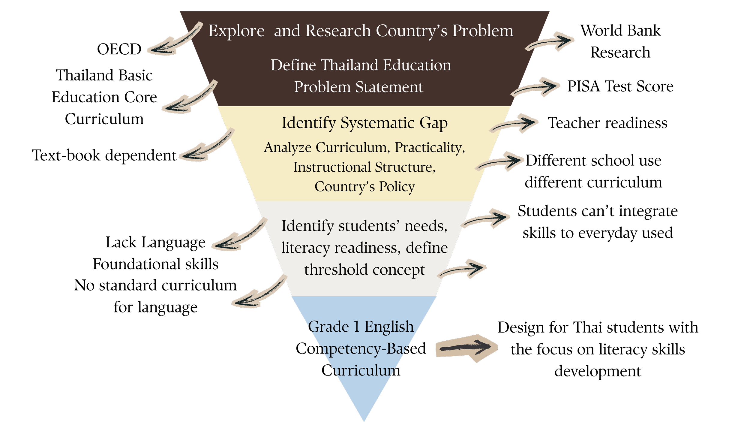 Design driven by change and improvement in Thai education, focusing on English literacy through a research-based, competency-based curriculum.