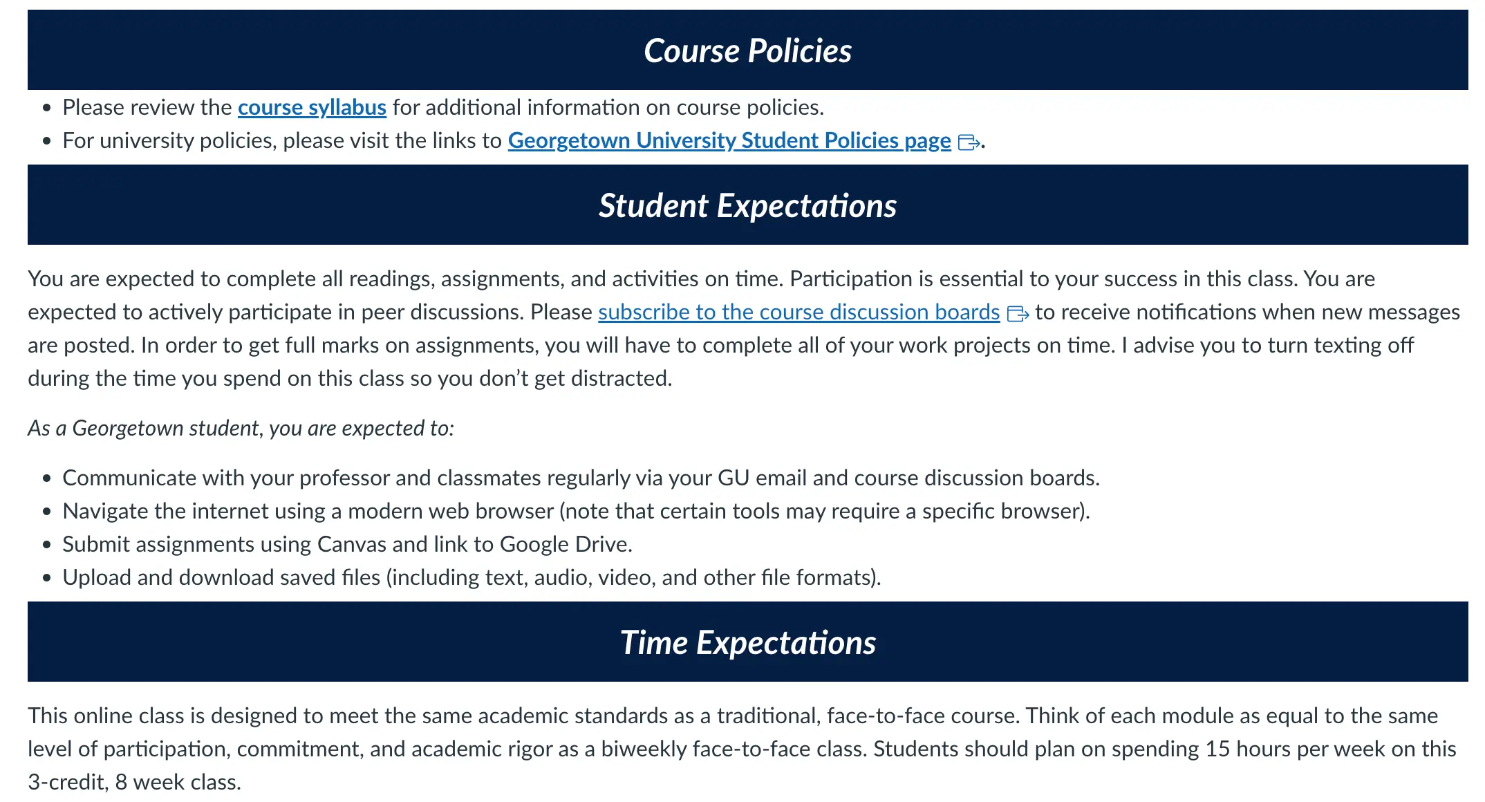 This module also introduces important course policies to ensure a respectful and transparent learning environment. Establishing these expectations early helps students understand how the course operates and how they should engage with the learning process.